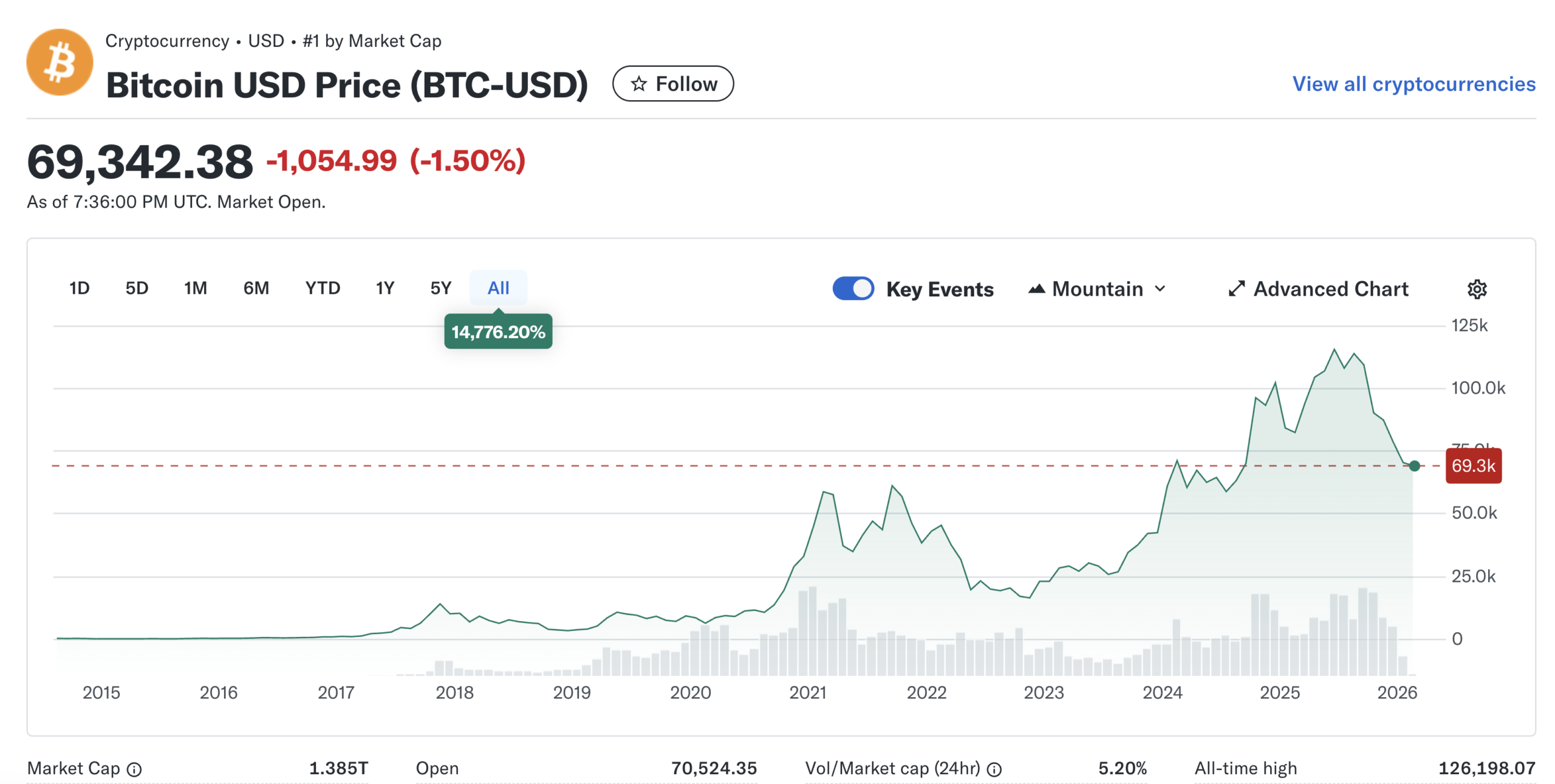 Bitcoin har i de første uger af februar 2026 været voldsomt svingende. Den aktuelle pris ligger omkring 68.828 USD (intraday ca. 67.477–71.612 USD). Det ændrer ikke ved, at markedet samtidig har været præget af dybe fald fra tidligere topniveauer og efterfølgende hop op igen, hvilket er klassisk for krypto, men også grunden til at timing kan være dyrt.
