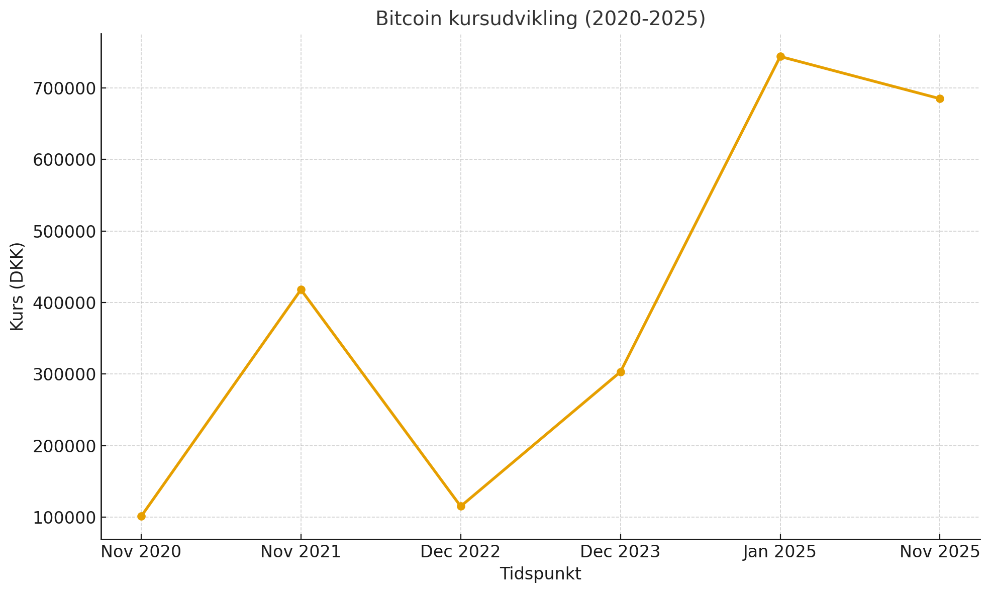 Her er grafen over Bitcoins kursudvikling fra 2020 til 2025 — tydeligt med et lavpunkt i 2020, et kraftigt bull-run i 2021, en markant nedtur i 2022 og en ny rekord i 2025, lidt aftagende hen mod november.